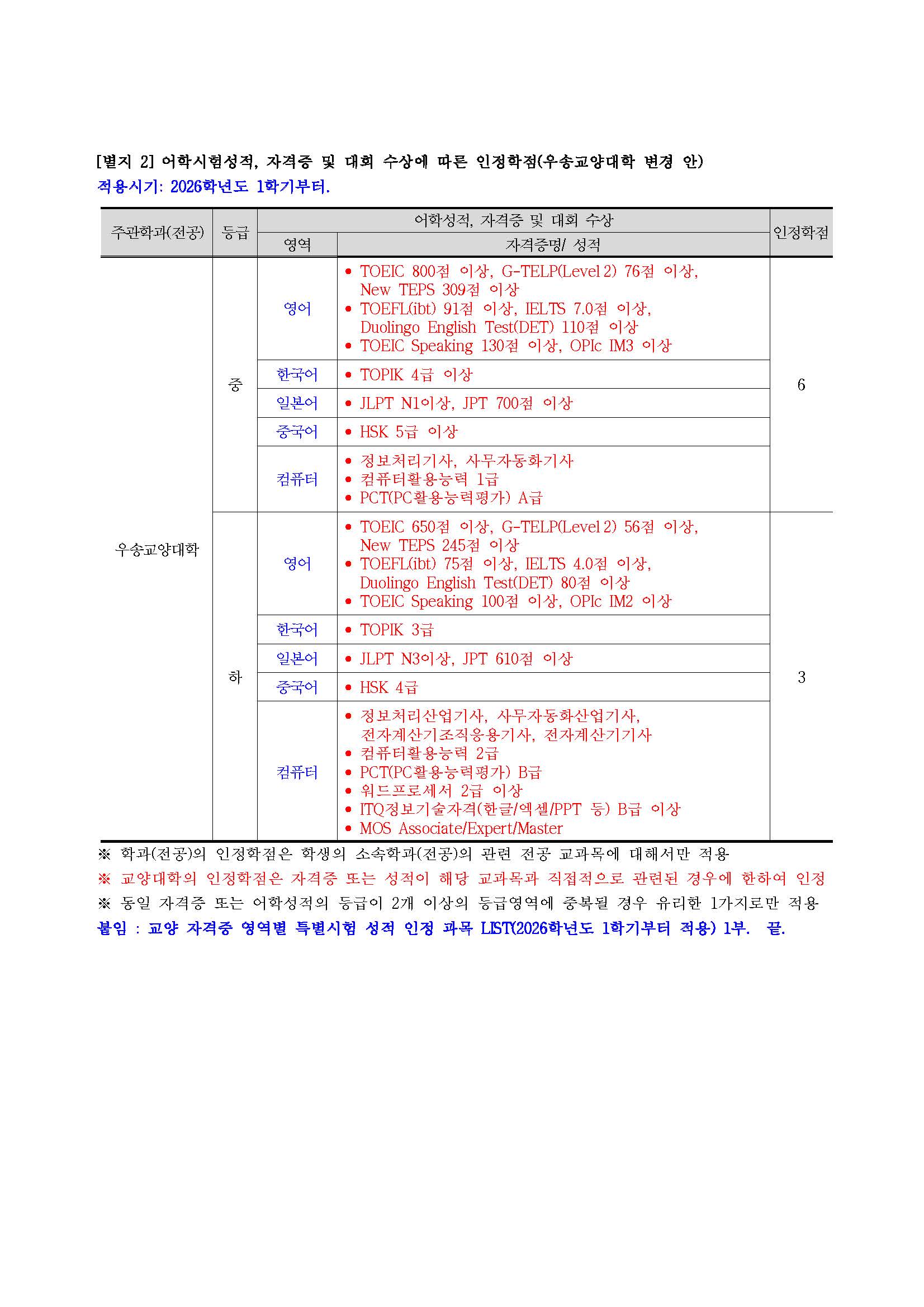 【특별시험 학점인정(교양 관련 어학 및 자격증) 인정 기준 변경 예정 안내】 첨부파일 공지