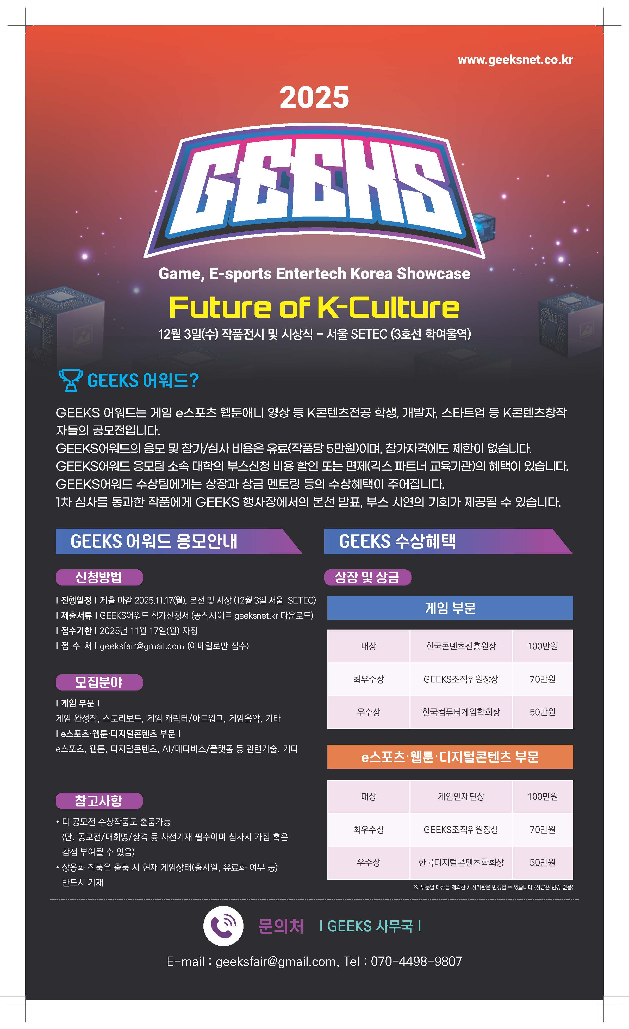 커뮤니티 공지사항 학과뉴스 공모전정보 공모전정보Home커뮤니티공모전정보 GEEKS 2025 어워드 공모전 홍보 안내 작성자 : 학과관리자 | 작성일 : 2025.10.27 | 조회수 : 3 첨부파일 GEEKS 어워드-edm-포스터1-2025.jpg 목록 이전글 이전 글이 없습니다. 다음글 2025년 인디게임공모전 인디유 예선 통과작 (대학부) - 대전지역